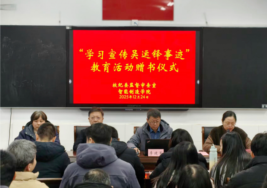 为深入学习贯彻习近平新时代中国特色社会主义思想,大力弘扬吴运铎同志“把一切献给党”的崇高精神,推动党风廉政建设与红色基因传承深度融合,2025年12月24日下午,由校纪委监督审查室主办、智能制造学院承办的“学习宣传吴运铎事迹”教育活动赠书仪式在B401室举行。校党委委员、智能制造学院院长姚小强以及校纪委副书记李建军、监督审查室主任张红出席仪式,学院综合办公室主任姚晓晨主持活动,全体党员及学生代表参加。