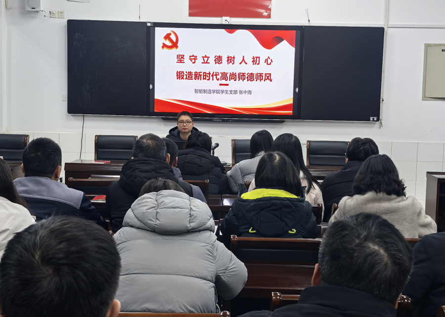 12月25日下午,学生支部书记张中海以《坚守立德树人初心 锻造新时代高尚师德师风》为题,为学院全体党员授课。党课从国家战略、教育使命、学院发展与职业本质四个维度,深刻剖析了新时代加强师德师风建设的极端重要性。课程系统阐述了新时代高校教师“政治强、情怀深、思维新、视野广、自律严”的核心内涵与行为准则,并结合学生工作实际,着重强调了全体教育工作者都应具备的仁爱之心、敬业精神与廉洁底线。党课号召全体党员,尤其是未来可能走上教师岗位的学生,要以“四有”好老师为标准,时刻自重、自省、自警、自励,将高尚的师德修养作为终身课题,为培养担当民族复兴大任的时代新人贡献青春力量。